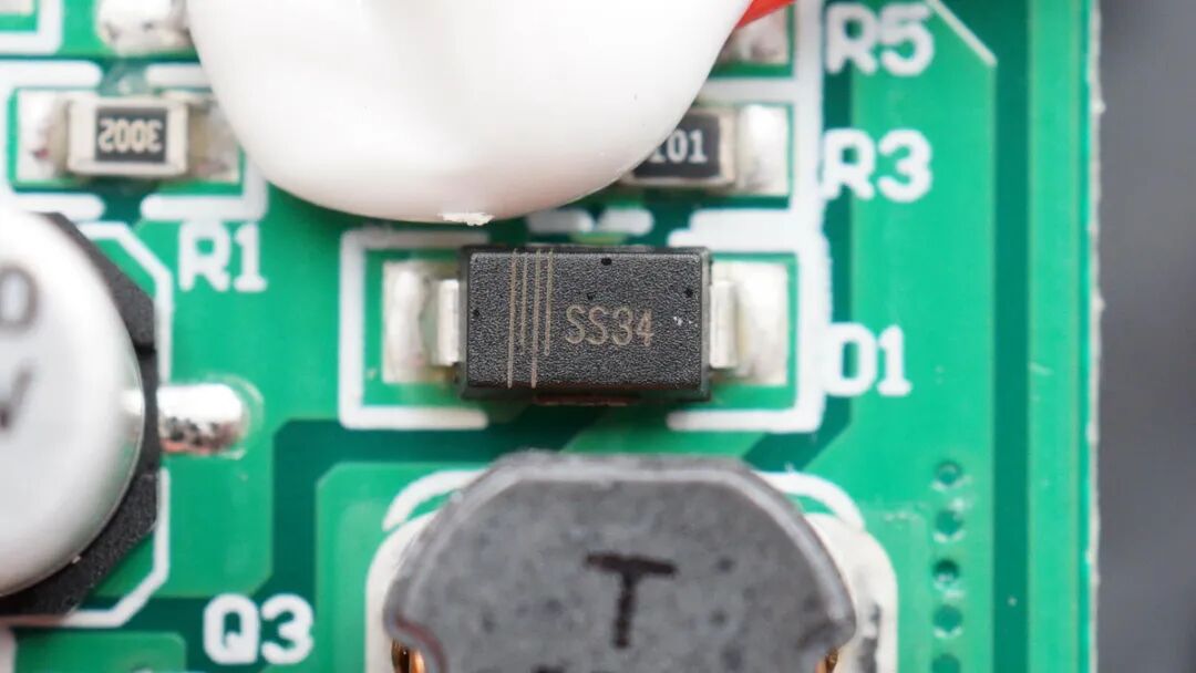 PCB板正面一览,以中间的芯片分界设有两个独立的升压电路,电感、电容、二极管成对配置,中间的芯片用于控制升压充电和指示灯显示充电状态。