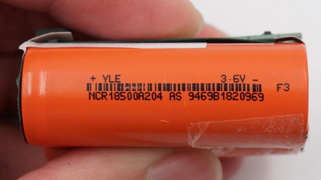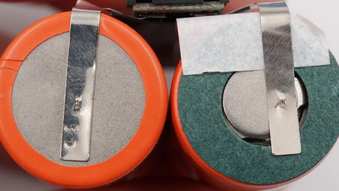 电池一端特写,镍片点焊,电池正极贴有青稞绝缘纸。