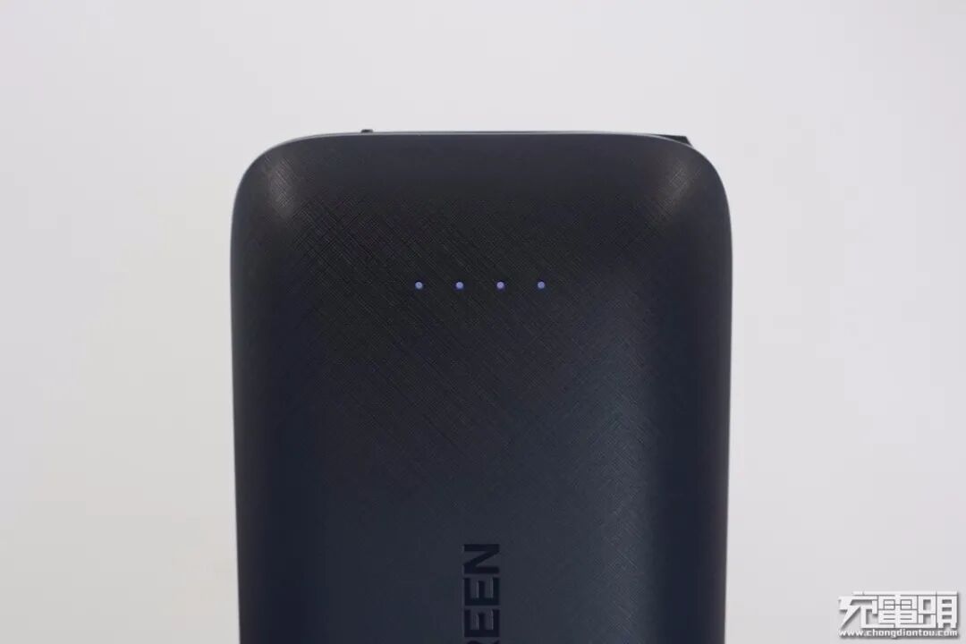 移动电源采用PC阻燃材质外壳,边角圆润,外壳采用激光雕刻纹理设计,正面凹印着UGREEN的品牌Logo。