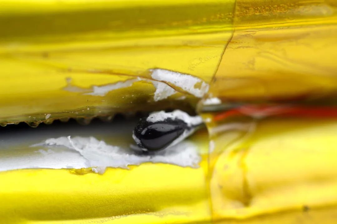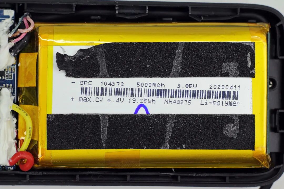 电芯特写,采用的是GPC格林德电芯,上面印有参数信息:长72mm,宽43mm,厚10mm;容量5000mAh/3.85V/19.25Wh,高压电池;生产日期2020年4月11日。