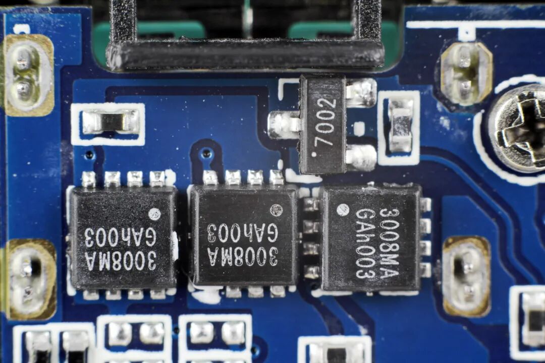 USB-A母座旁的三颗芯电元PED3008MA,用于输出端口切换。还有一颗2N7002 MOS管。
