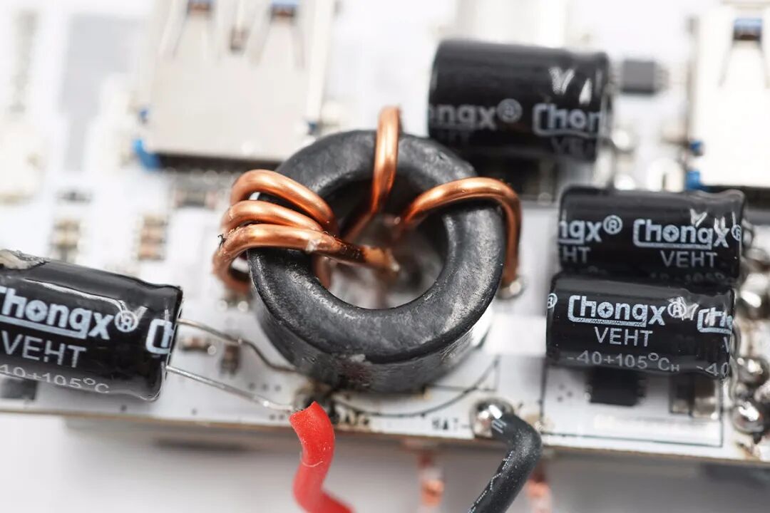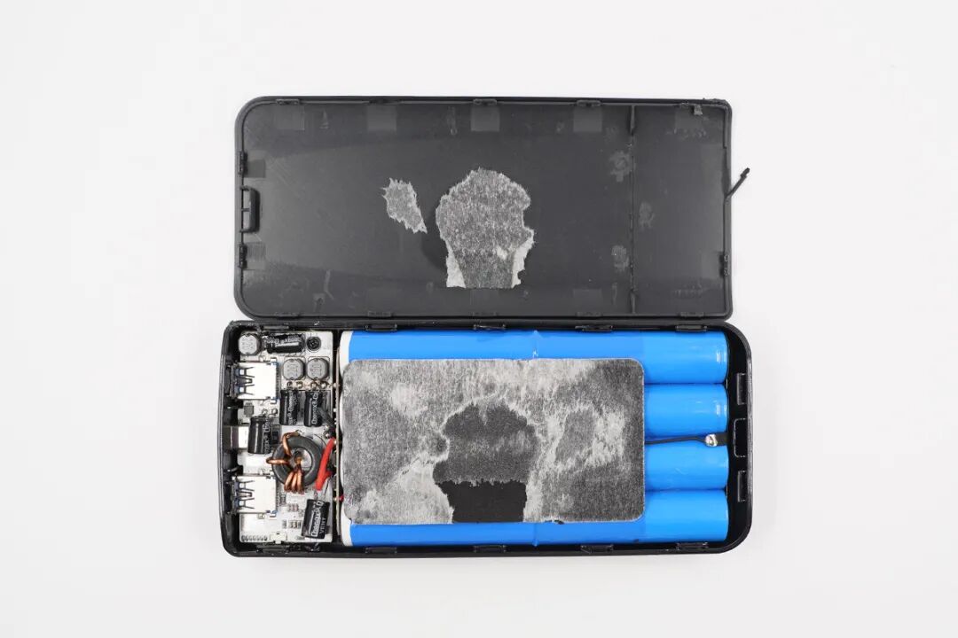 移动电源内部设有多颗滤波电容进行二次滤波,输出纯净;电芯使用蓝色电池塑封皮和泡棉胶进行固定,内部稳定性有保证;线芯焊接牢固,电芯镍片点焊连接,无线充电线圈绕制紧密,产品整体做工扎实。