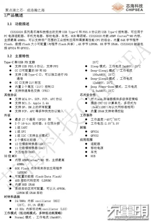 Chipsea芯海科技CS32G020K8U6 32位MCU,CS32G020系列是芯海科技推出的支持USB Type-C和PD3.0协议的USB-C控制器,可应用于PC电源适配器、手机充电器、移动电源、车充、HUB等领域。