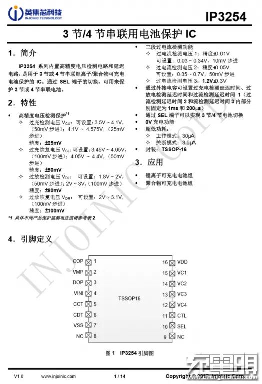 电芯输入输出锂电保护芯片采用英集芯IP3254。这是一颗3-4串锂电保护IC,具有高精度电压检测保护和超低功耗,适合应用于多串锂电池组电芯保护。
