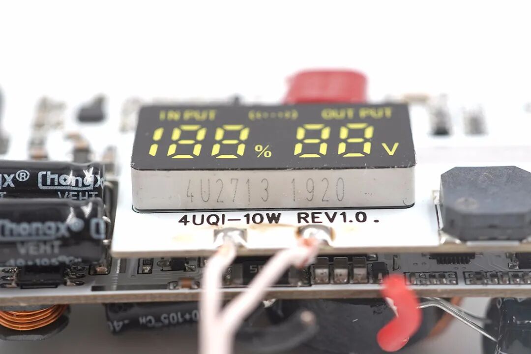 无线充所在小板正面一览,上面焊接有LED显示屏和无线充谐振电容等器件。