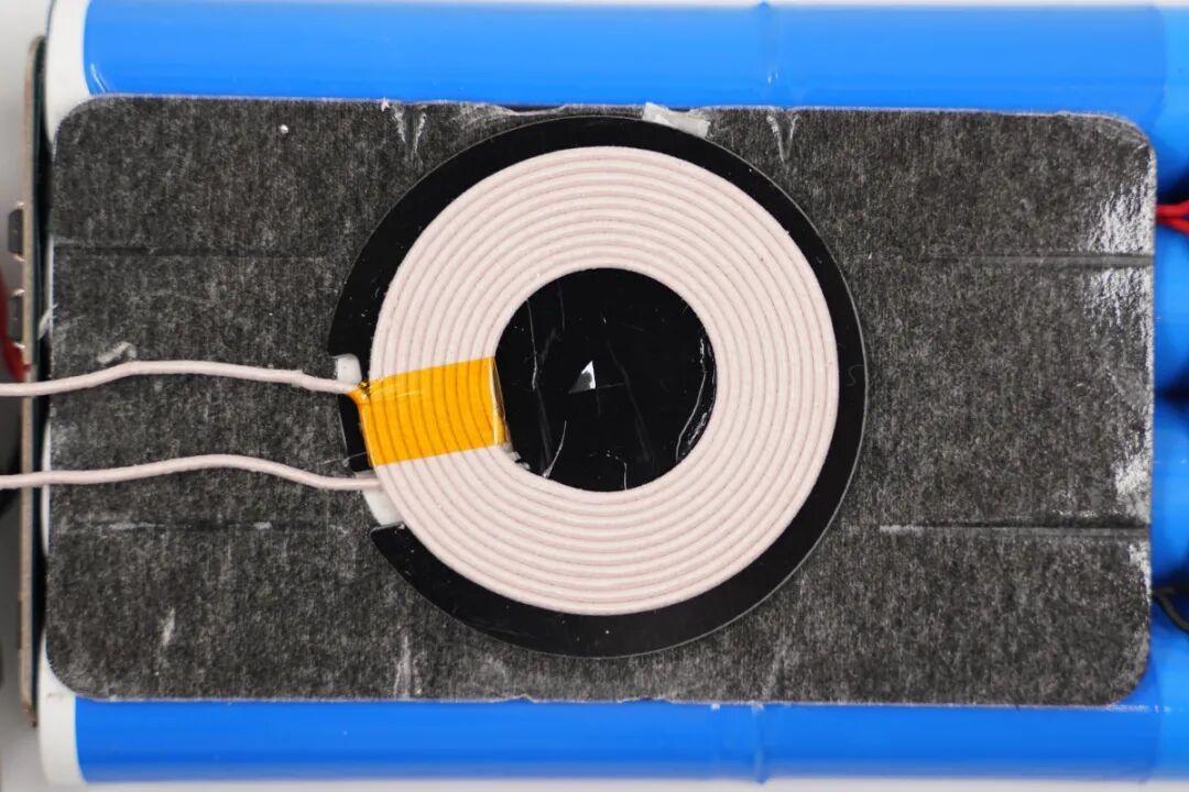 无线充电线圈特写,使用胶带捆绑固定线圈引出线。