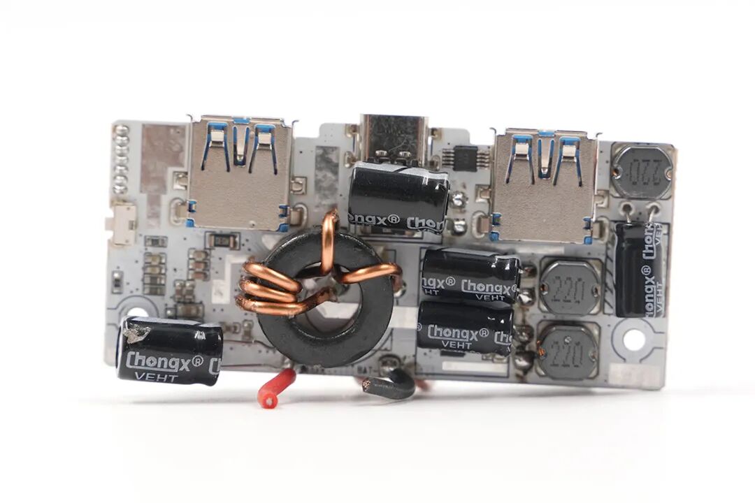 PCB板背面一览,设有USB-C升降压电路、USB-A和无线充三路降压电路。