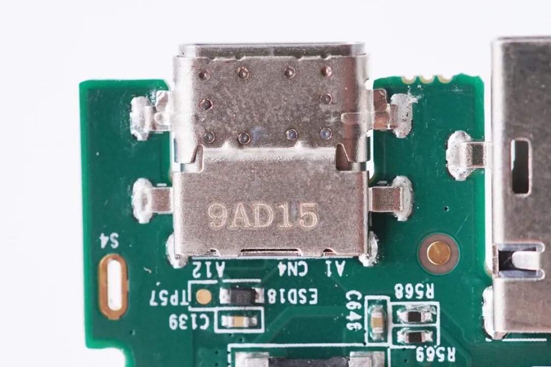 USB-C母座外套金属壳点焊加固,并刻有9AD15字样。