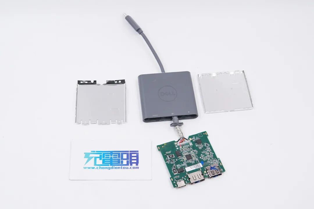 DELL戴尔这款三合一扩展坞机身扁平且自带USB-C线缆,小巧轻便易使用,外出可满足笔记本的日常活动需求。充电头网通过拆解了解到,扩展坞内部使用了赛普拉斯和万代AOS等知名厂家芯片,用料扎实,PCB板上有金属壳覆盖,保护性更强。