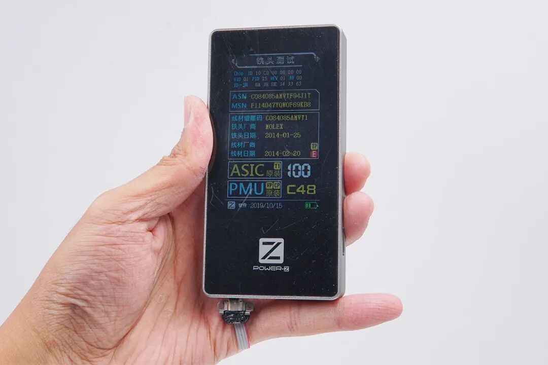 对Lightning端子使用ChargerLAB Power-Z MF001测试仪进行测试,从测试仪的屏幕中可以看到,ASIC、PMU均为原装C48元件,评分为100分,生产日期在2014年。
