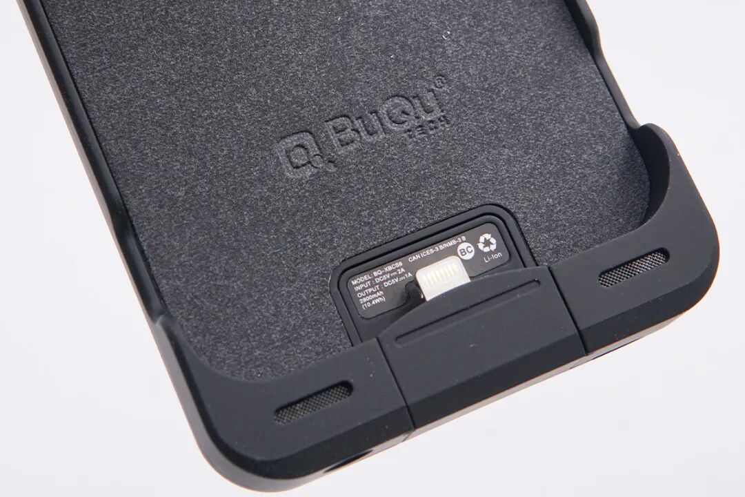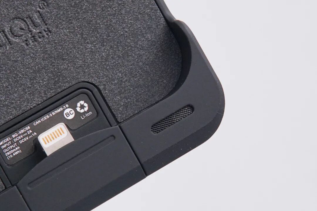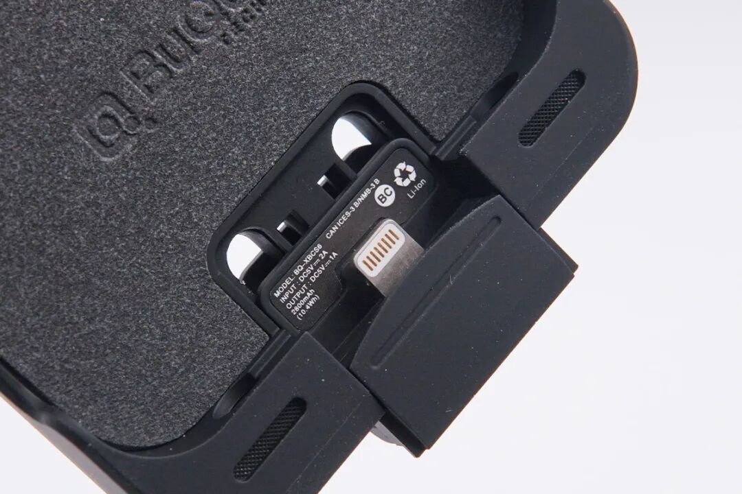 机身底部配有Lightning输入端子,并采用可滑动设计,方便手机放入。端子下方贴有信息标签,型号为BQ-XBC56,输入5V2A,输出5V1A,容量2800mAh(10.4Wh)。