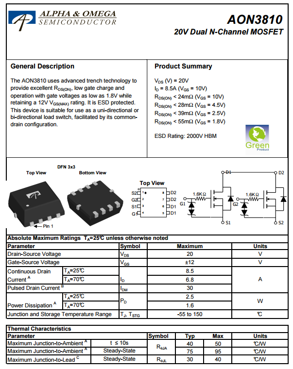 万代AOS AON3810电池保护管,NMOS,耐压20V。