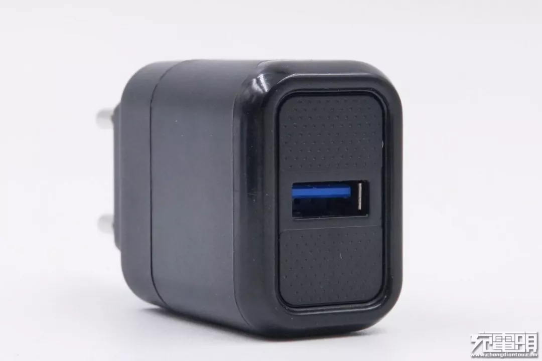 这是一款18W的QC快充充电器,采用蓝色胶芯表示支持快充。