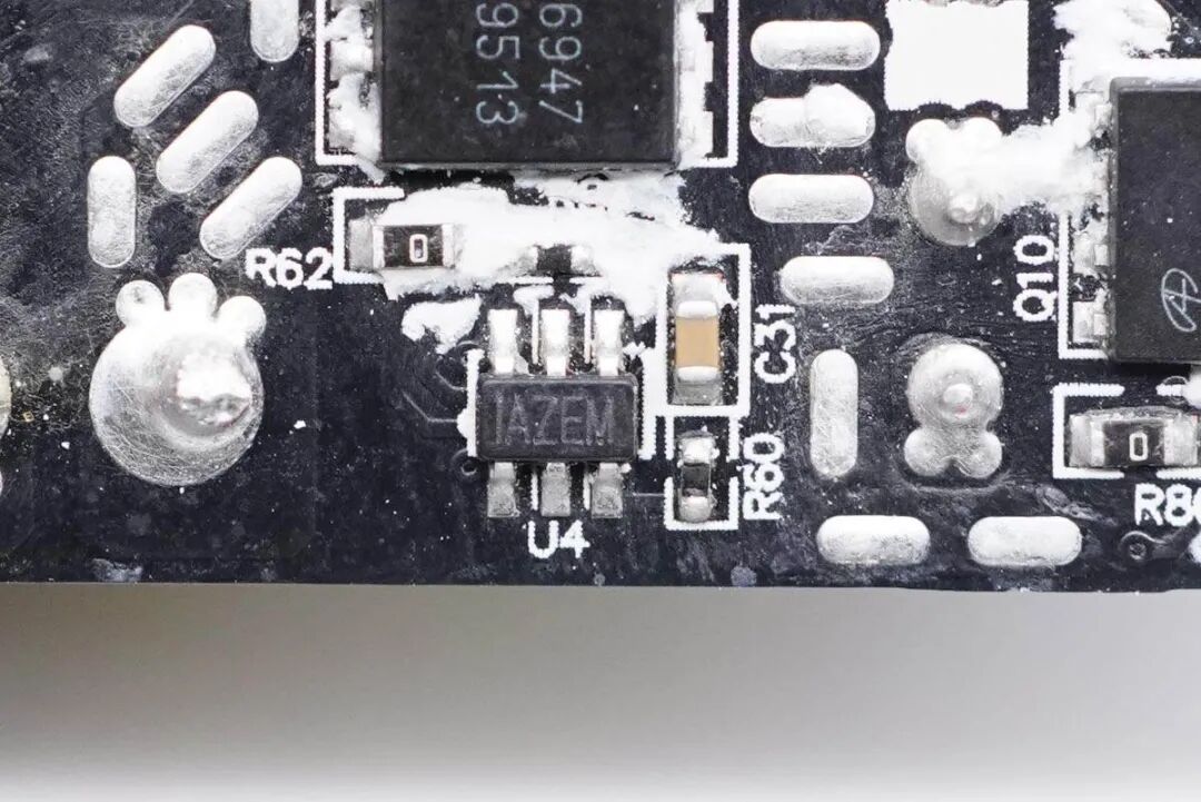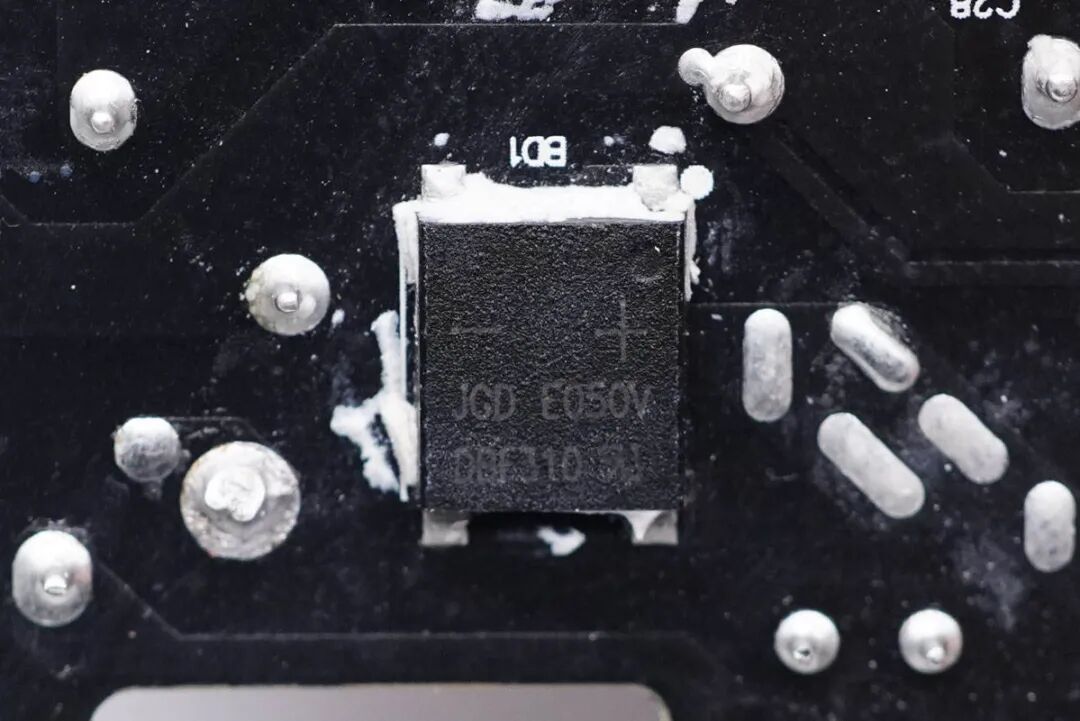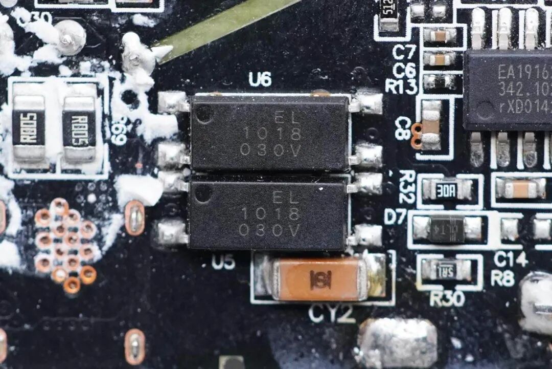 PCB板背面一览,两颗光耦横跨在初次级之间,初级侧有两颗整流桥、初级开关MOS管、PFC升压控制器;次级侧有同步整流控制器、同步整流管和输出VBUS开关管。