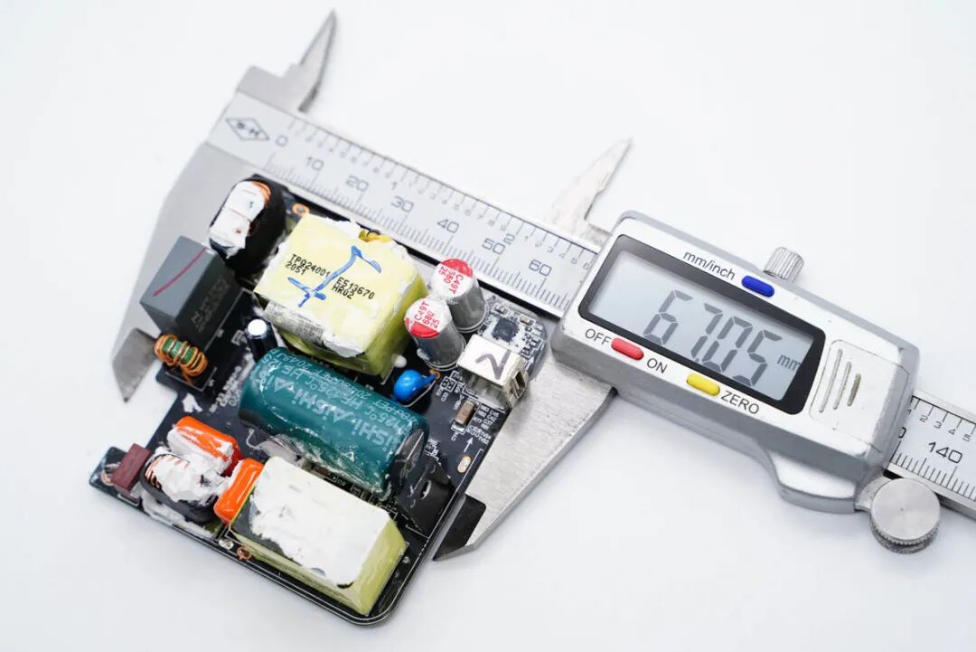 使用游标卡尺实测充电器主板长度为67.05mm。
