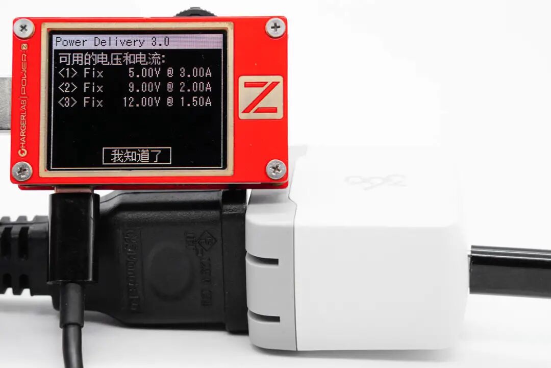 使用ChargerLAB POWER-Z KT002测得USB-C口支持Apple 2.4A、Samsung 5V2A、DCP协议,以及PD3.0快充协议。