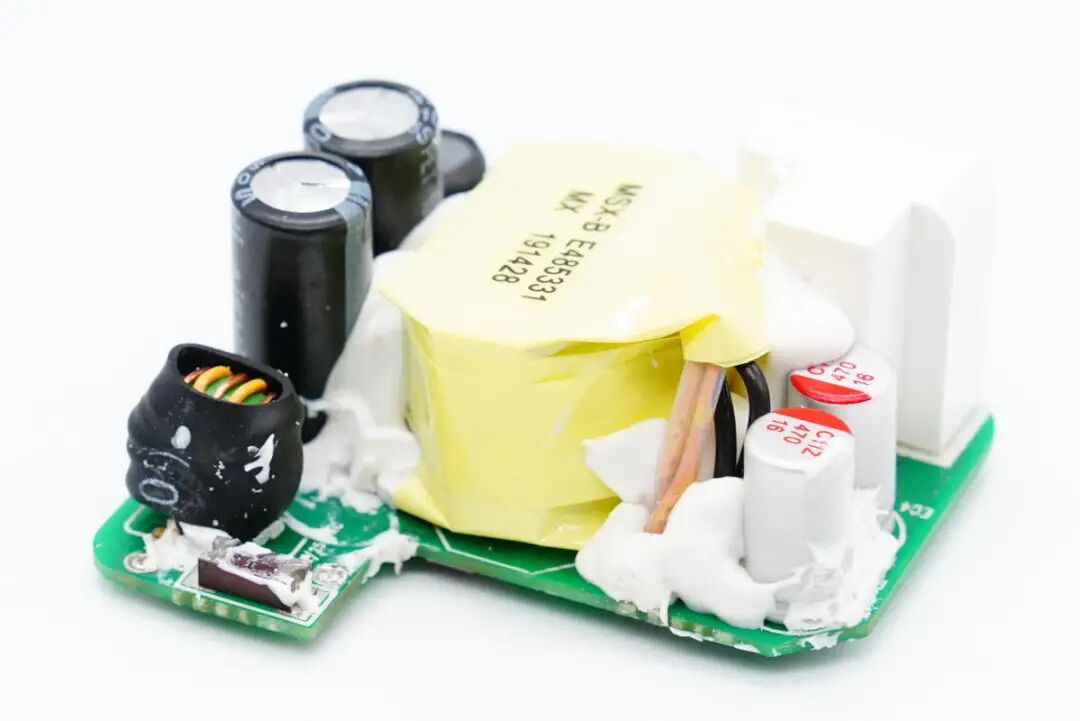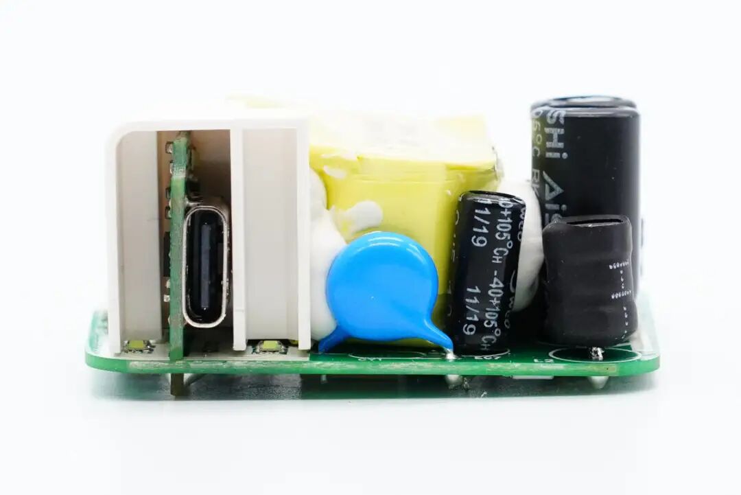 PCB板正面一览,变压器以及输入输出滤波电容均打胶加固,输出端USB母座外套塑料壳。