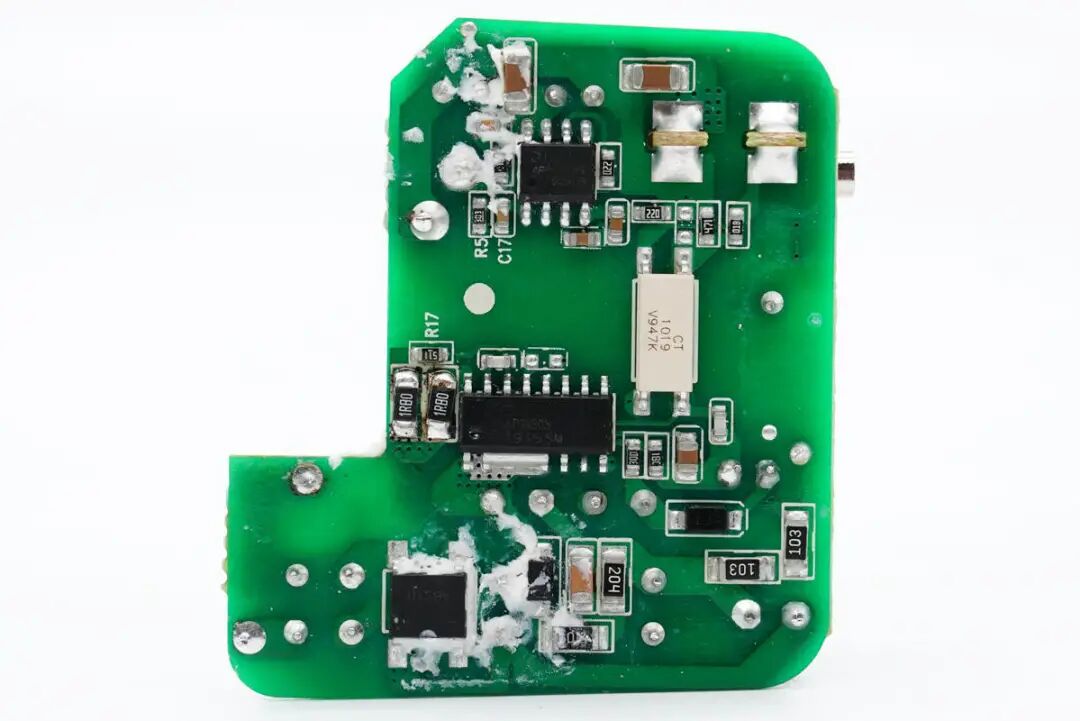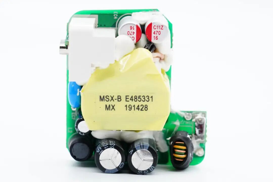 PCB板背面设有整流桥、主控芯片、光耦和同步整流芯片,初次级分界明显,方案高度集成,电路十分精简。