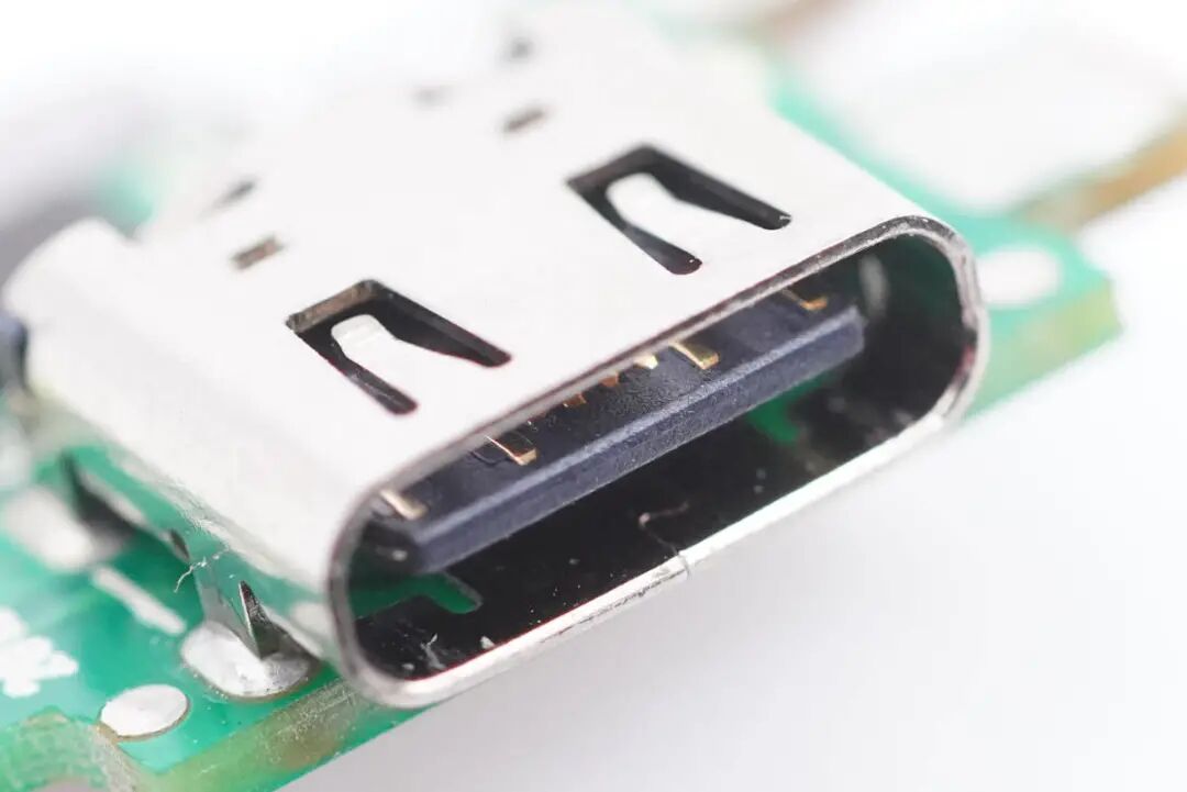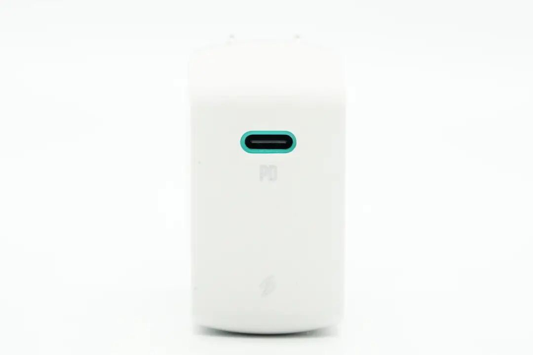 输出顶面USB-C口黑色胶芯不露铜,接口采用青绿色塑料环装饰,下方印有PD字样。