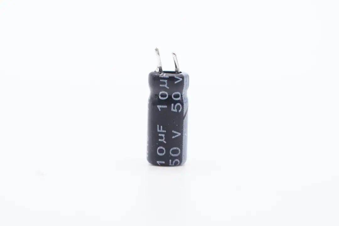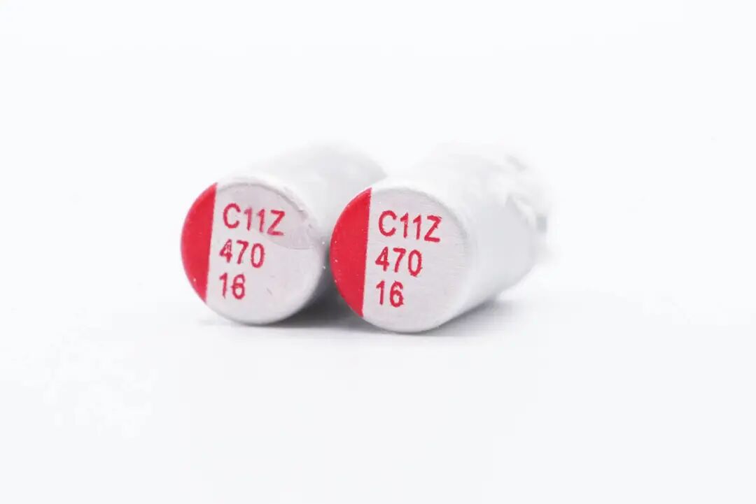 两颗输出滤波固态电容特写,规格均为16V 470μF。