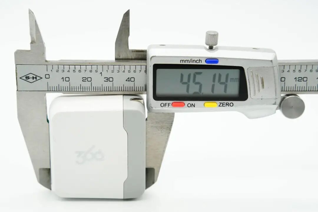 使用游标卡尺实测充电器机身高度为45.14mm。