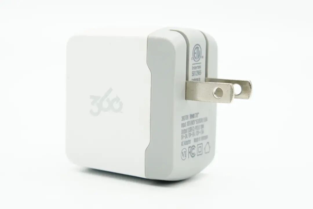 充电器采用梯形造型设计,上窄下宽,输入端机身壳为灰色,另一部分外壳则为白色,机身壳上印有360字样,整体设计十分有特点。