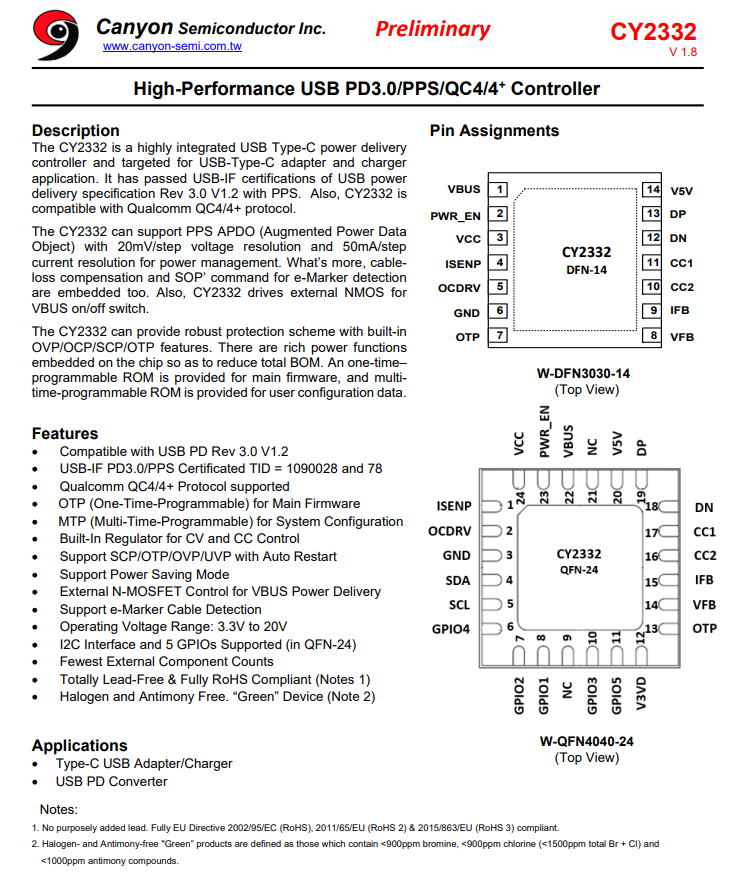 协议芯片采用耕源CY2332,有适用于一般应用的小封装DFN-14 及适用于多口应用的QFN-24 (含I2C 通讯功能)封装。CY2332基于解码器的MCU,通过I2C功能连接其他有I2C功能的产品, 以达成智能分配功率的效果, 而无需再外挂单芯片机处理。