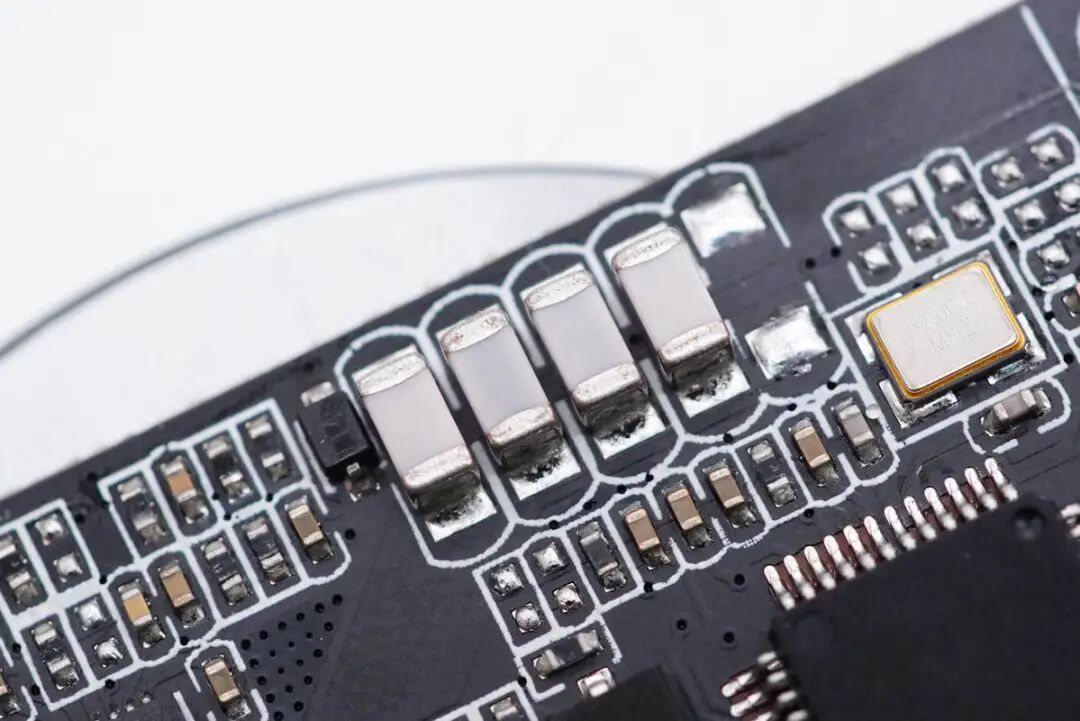 PCB板背面一览,设有LED指示灯,电感和电容沉板设计,降低产品厚度。