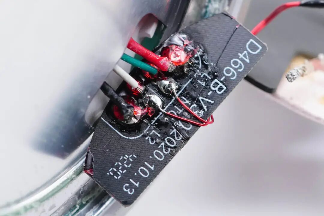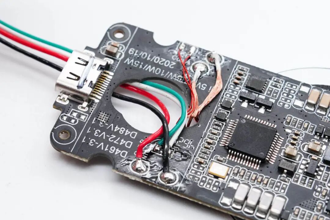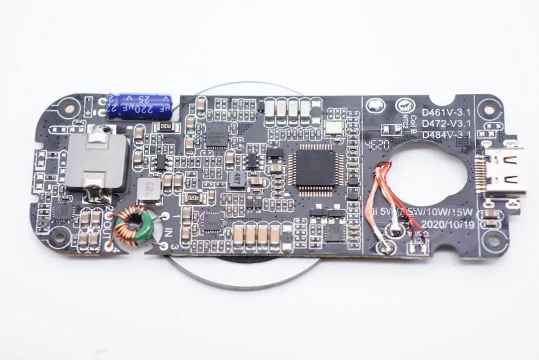 手机无线充电板通过红黑白绿四根导线和PCB板连接。