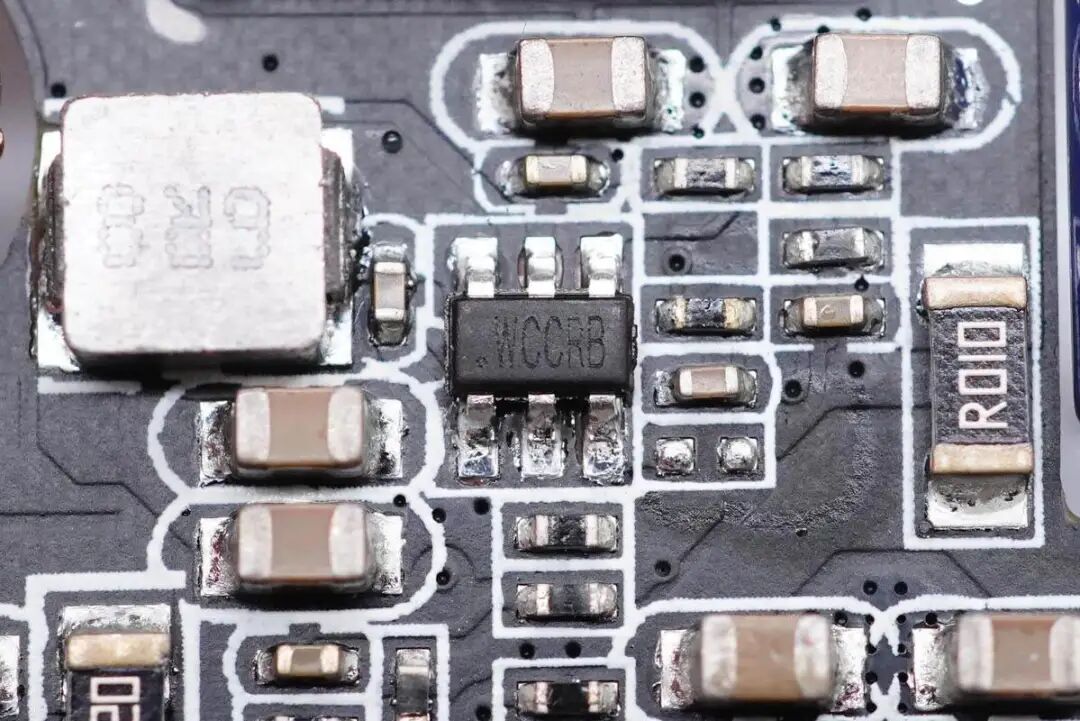 另一颗降压转换器特写,丝印WCCRB,降压为耳机无线充电路供电。