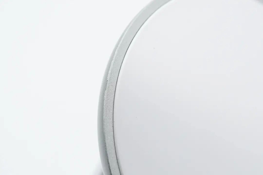 无线充采用PC阻燃材质塑料壳,正面喷刷银灰色涂料装饰,底座与手机无线充电板采用圆盘设计,设计风格简约。