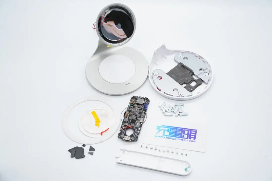 充电头网通过拆解了解到,无线充底座内置配重铁,使得产品日常使用不易翻倒,支撑板内加入金属片提升强度,不易折断。此外PCB板上USB母座、电感、电容等器件均沉板处理,降低机身厚度,设计细节讲究。