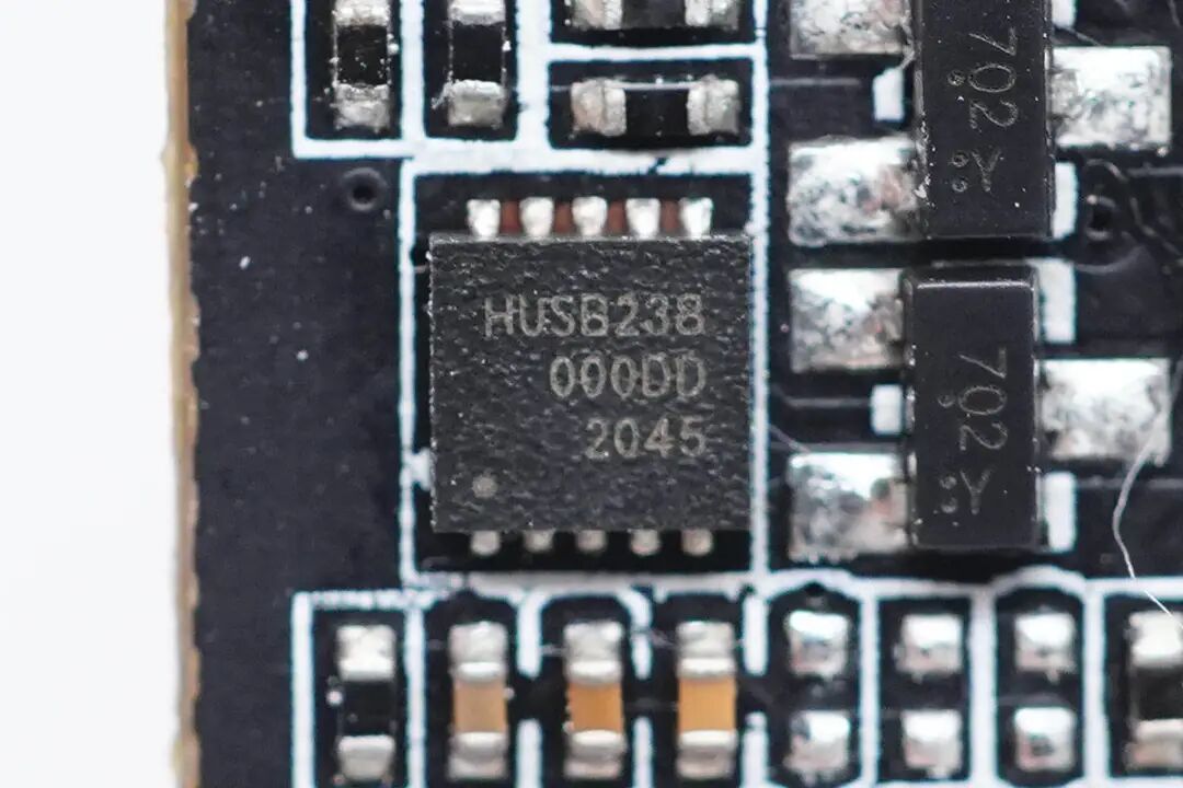 USB-C口控制器采用慧能泰HUSB238,用于接口输入电压控制。这是一颗极简的USB PD Sink(PD受电端芯片,也叫PD诱骗芯片)芯片,已经通过USB-IF PD3.0认证,TID 号3666。HUSB238耐压可达30V,功耗非常低 ,使用极简,传输额定功率最高可达100W;兼容PD3.0 V1.3和Type-C V1.4,还可以支持BC1.2 DCP、CDP和SDP和Apple 5V2.4A充电协议。