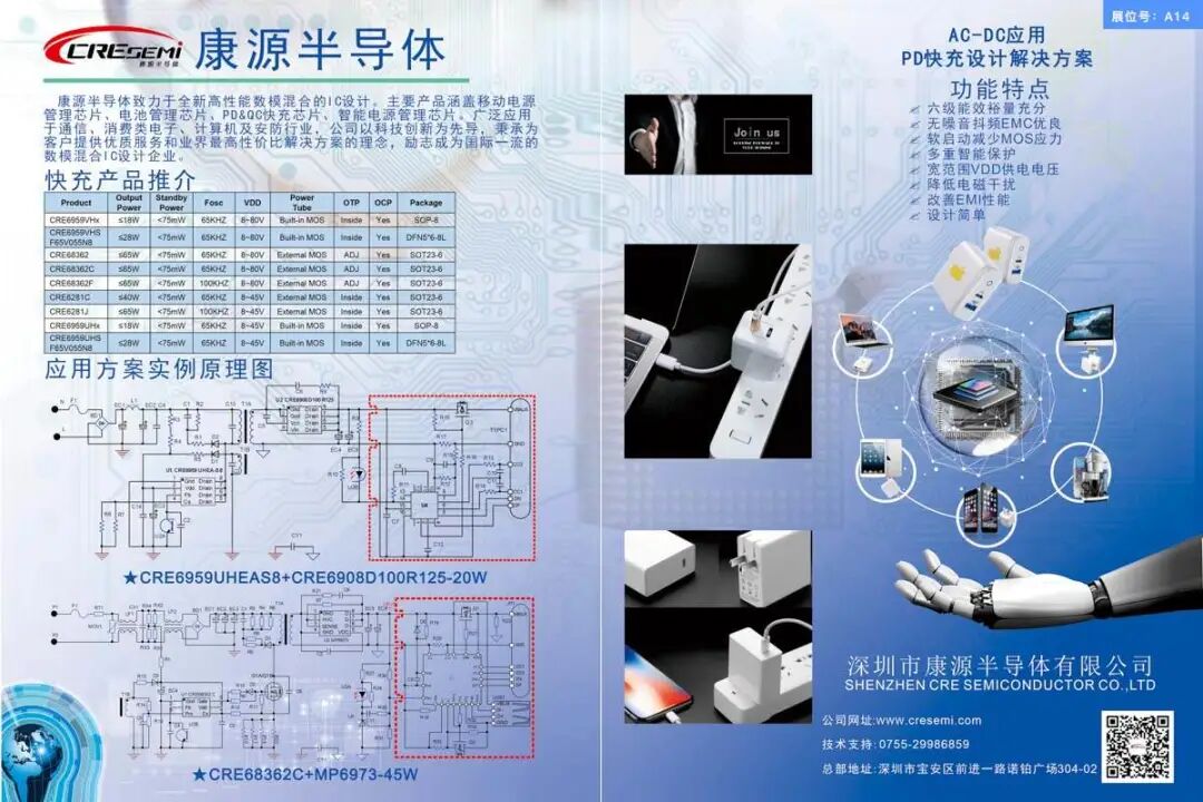 康源半导体在本次展会上带来了一款一款迷你快充方案和一款45W充电器方案,康源半导体针对20W PD快充市场推出了一套高集成、体积迷你的20W PD快充方案套片。AC-DC部分,主控芯片采用康源CRE6959UHEA-S8,搭配自家同步整流芯片CRE6908D100R125。同时还有一款45W方案,采用康源CRE68362C主控芯片。康源有多款内部集成MOS的初级芯片可选,可用于不同设计。