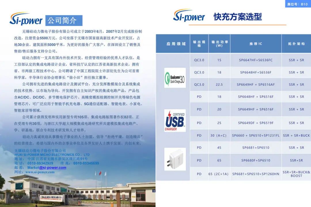 无锡硅动力微电子股份有限公司成立于2003年6月,拥有一支具有国内外技术开发、经营管理经验的优秀人才队伍,以市场为导向,开发自主知识产权的芯片产品,是工信部认定的集成电路设计企业。在本次大会上,硅动力将为大家带来QC/PD 18W、20W、30W、45W、65W旅充及车充解决方案,同时还有18W、24W、36W小体积高性价比适配器解决方案。欢迎各厂商前来洽谈合作。
