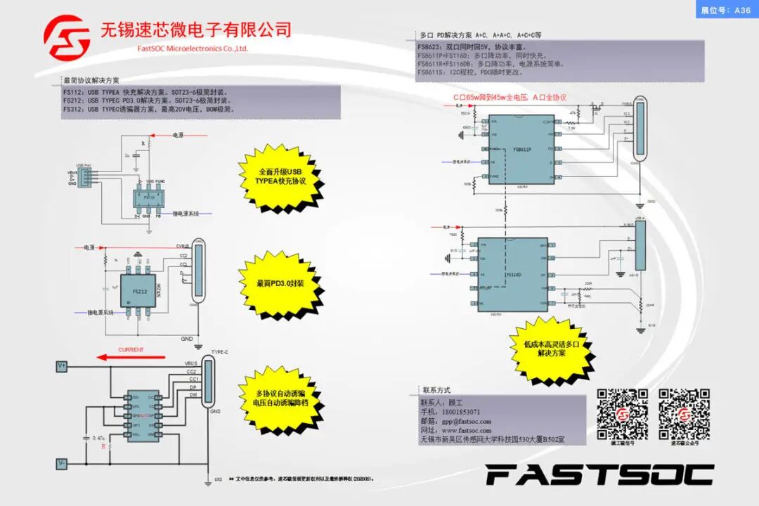 速芯微在本次展会上推出三款简化的协议解决方案,FS112和FS212是SOT23-6封装的协议IC,FS112用于USB-A快充协议,FS212用于USB Type-C接口,PD3.0协议,FS312是USB Type-C接口取电方案,三款产品外围非常精简。此外还有多款低成本高灵活多口PD解决方案。