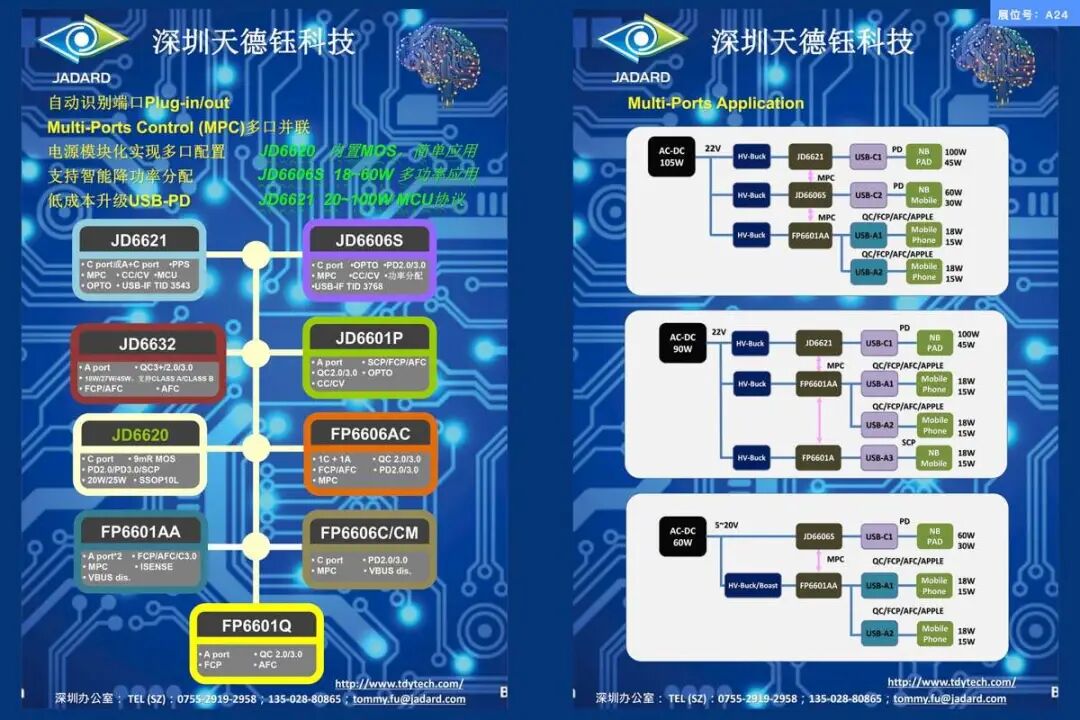 天德钰科技在快充协议芯片已深耕许久,推出了USB-IF协会PD3.0/PPS认证的快充协议芯片JD6621(TID:3543)和JD6606S(TID:3768),为苹果20W PD快充产品的开发提供兼容性保证。同时,天德钰还拥有符合高通最新QC5.0协议的芯片,为快充充电器、快充移动电源及快充车充应用提供芯片支持,实现多口不同设计。