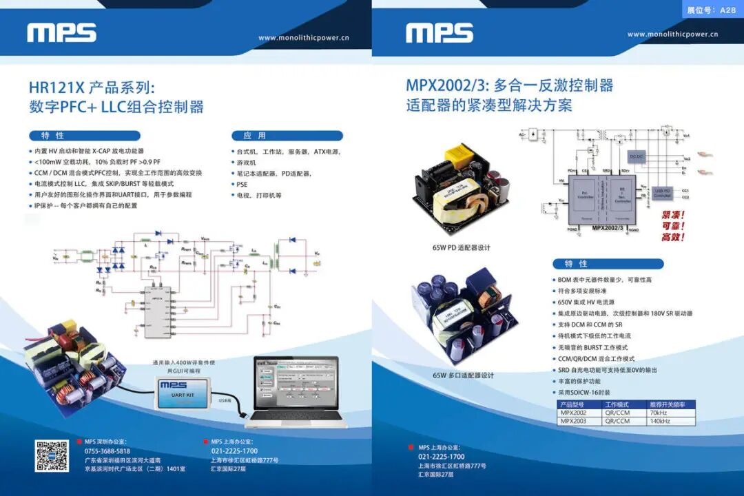 MPS推出了两款全新的开关电源AC-DC设计,HR1211为集成PFC控制的数字化LLC控制器,可搭配氮化镓开关管并以高频率运行,具有低待机损耗和高功率因数优势,还可使用图形化界面编程参数,是一款非常有竞争力的LLC控制器。同时还带来了一款多合一的MPX2002/3反激控制器,内部集成原边驱动电路,次级控制器和同步整流控制器,可简化适配器电路。
