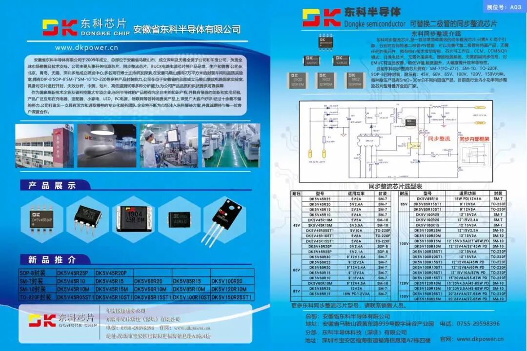 东科半导体在本次展会上推出多个耐压规格,不同封装的同步整流芯片。东科同步整流芯片只有两个引脚,可直接替换肖特基二极管,无需外围元件。耐压分为45V、60V、85V、100V、120V、150V六种,支持开关电源和PD快充适配器应用。并且具有多种封装适配不同使用环境,产品型号齐全,可降低温升提高适配器转换效率。