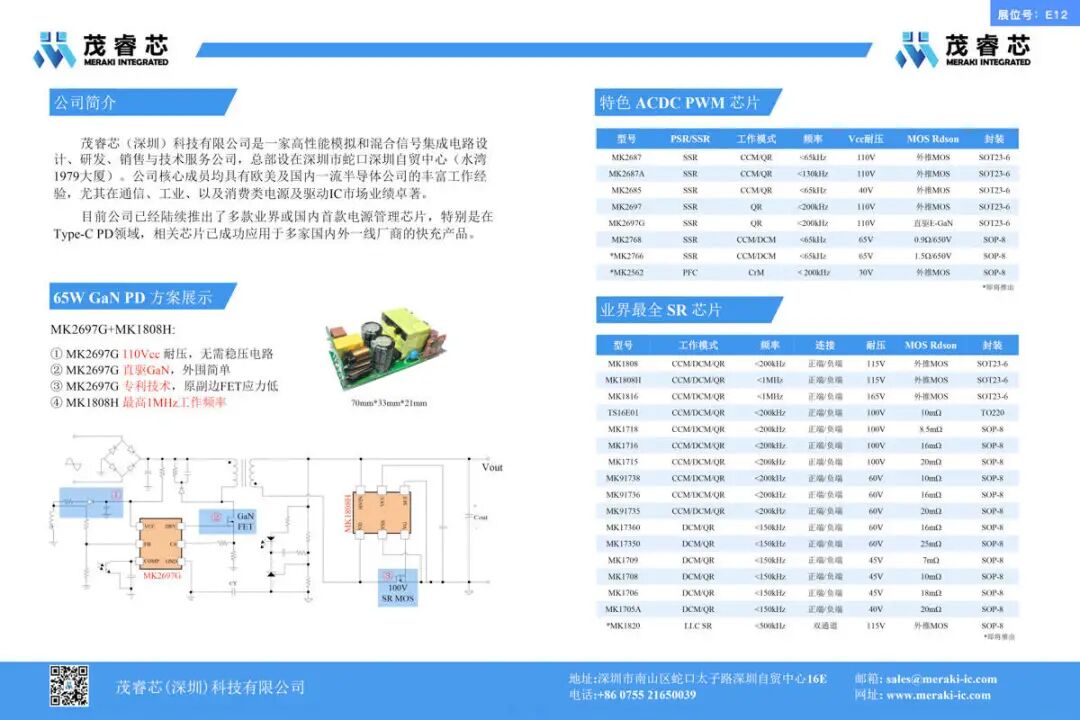茂睿芯科技有限公司是一家高性能模拟和混合信号集成电路设计、研发、销售于技术服务公司。在本次展会上带来了基于MK2697G+MK1808H的65W氮化镓PD参考方案,茂睿芯MK2697G支持110V供电,无需外置稳压电路,同时可直驱氮化镓开关管,外围简单。茂睿芯MK1808H支持最高1MHz工作频率。同时,茂睿芯还带来了一系列的AC-DC PWM芯片和非常全面的同步整流芯片。