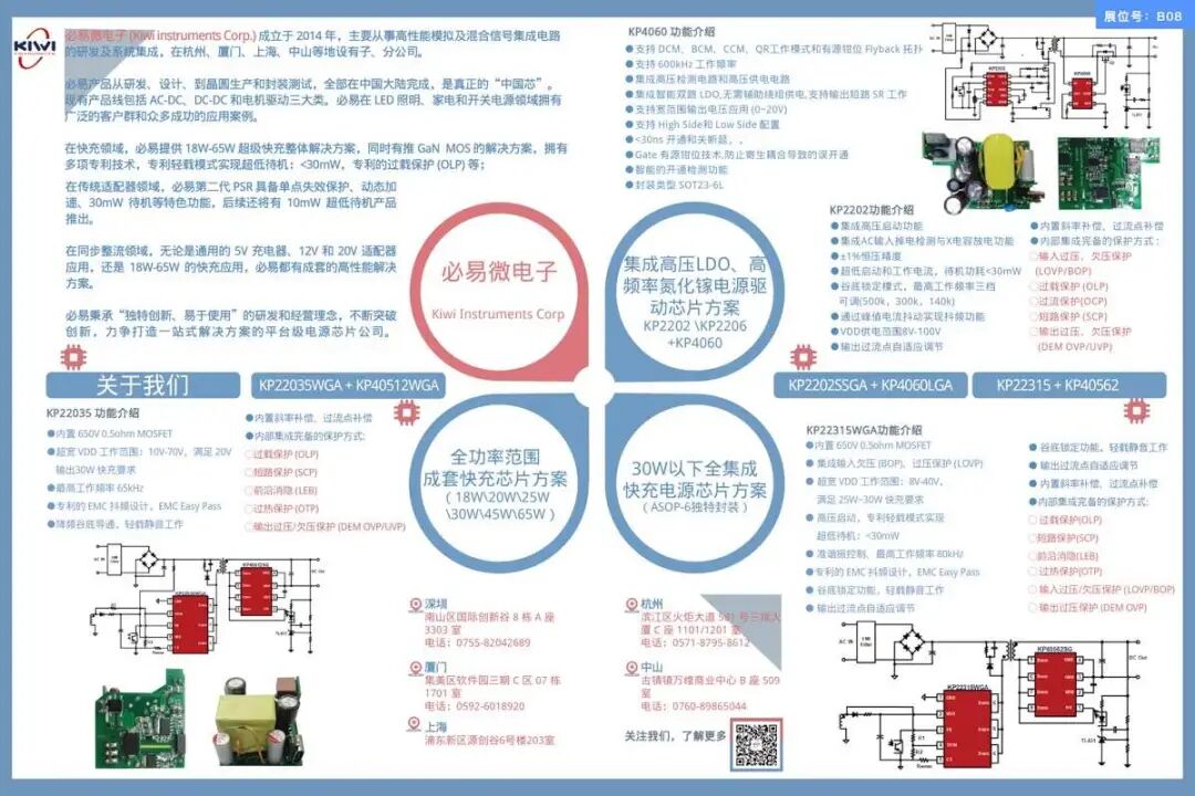 在本次展会上,必易微电子推出全功率范围的成套快充芯片解决方案,功率范围18-65W。30W以下全集成快充电源芯片方案。高频氮化镓电源驱动芯片方案,最高支持600KHz工作频率,支持宽范围电压输出。必易产品从研发设计、晶圆生产及封测全部在国内完成,是真正的中国芯,必易提供成套的高性能解决方案,打造一站式解决。