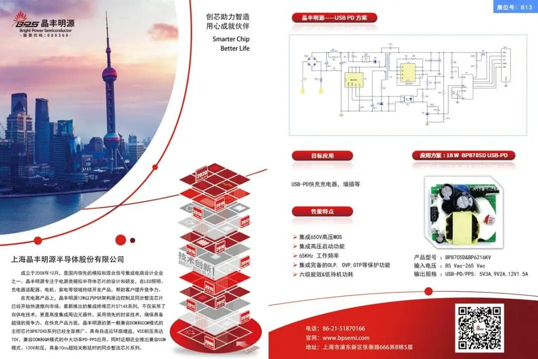 上海晶丰明源半导体股份有限公司成立于2008年10月,是国内领先的模拟和混合信号集成电路设计企业之一。晶丰明源专注于电源类模拟半导体芯片的设计和研发,在LED照明、充电器、适配器、电机、家电等领域持续开发产品,帮助客户提升竞争力。晶丰明源在展会上带来了一款18W的高集成PD快充方案,采用BP8705和BP6216芯片,内部集成MOS管,具备低待机功耗的优点。