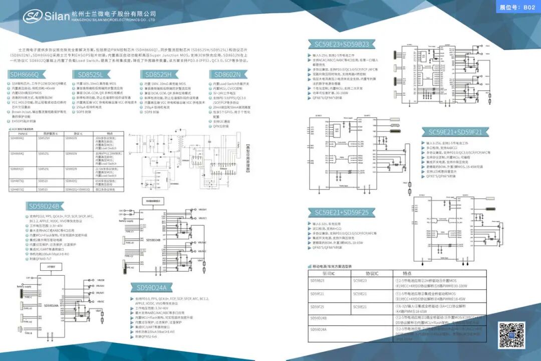 士兰微电子提供多协议快充全套解决方案,其中AC-DC方案采用芯片内置开关管的高集成方式,支持20-65W输出。移动电源采用不同的协议IC搭配不同的驱动IC,可实现18-100W功率输出,协议支持广泛,其中SC59E23+SD59B23的组合支持两路H桥控制,SD59D24系列单芯片移动电源解决方案支持2-5节电池应用。SC59E21+SD59F25车充方案支持18-65W输出。