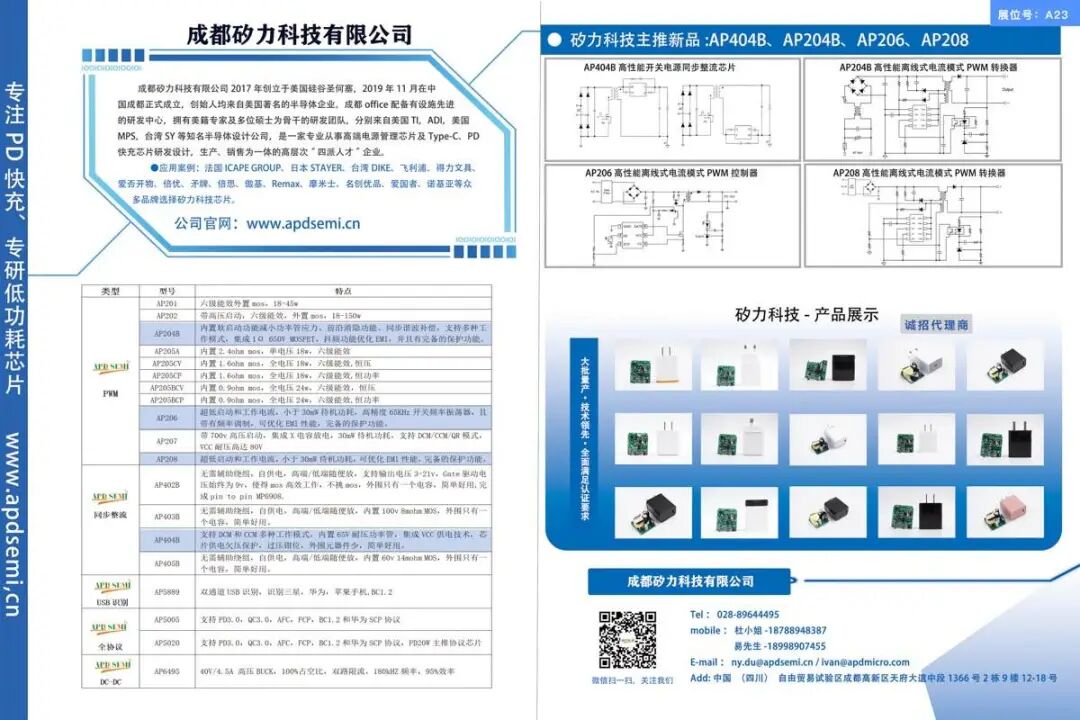 深圳三浦微是一家国家级的高新技术企业,在本次展会上主推一款20W快充方案,初级和次级同步整流均内置MOS管,支持DCM/QR/CCM工作模式,并且具备完整的保护功能,可实现A+C双口输出。三浦微还推出了一系列电源芯片,涵盖5-24W的AC-DC电源管理芯片,12-60W的PD快充电源管理芯片,10-24W的内置整流管的同步整流芯片和外置MOS的同步整流控制器。