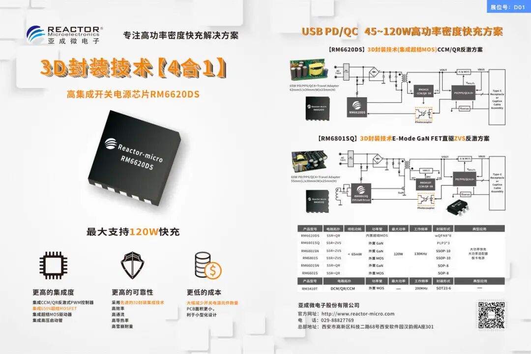 亚成微电子是一家专注高功率密度快充解决方案的公司,本次展会上带来了45-120W的高功率密度PD快充解决方案,其中RM6620DS采用3D封装技术,内部集成超结MOS管,采用QFN8*8封装,高集成度简化电路设计,同时3D封装技术可提高导热量和效率,实现更高的可靠性,同时高度集成的芯片还可大幅减少开关电源元件数量,从而降低成本。亚成微还有多款驱动芯片,可驱动外置GaN或者MOS。