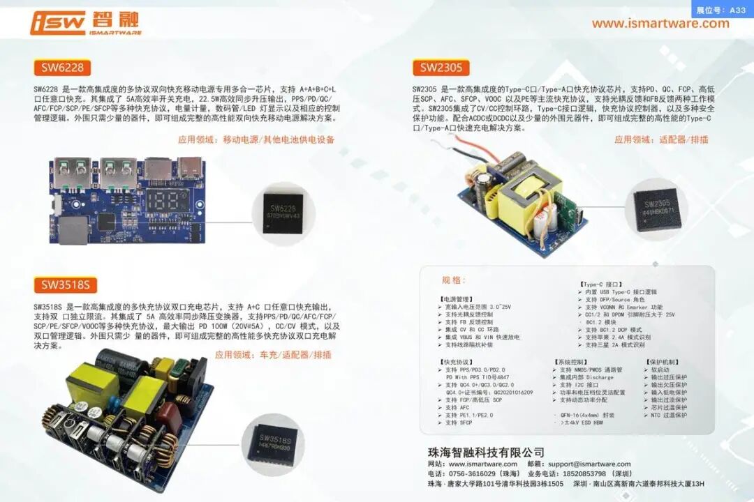 智融科技在本次展会上推出了三款极具代表性的产品,分别是SW6228高集成度的多协议双向快充移动电源多合一芯片,SW3518S支持双口协议的高集成度多快充协议双口降压充电芯片和SW2305高集成度的支持USB Type-C和A口的协议芯片。三款产品集成度都非常高,功能强大,涵盖不同应用领域。