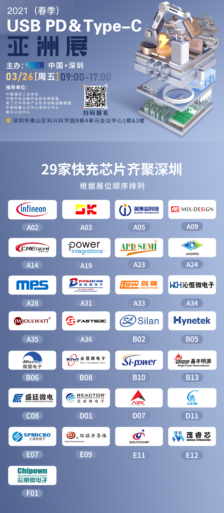 2021(春季)USB PD&Type-C亚洲展将于3月26日(周五)在中国深圳举办,这是2021年首场规模庞大的消费类快充电源行业展会。展会现场将有百余家USB PD&Type-C产业链企业带来上千款产品案例,同时也将吸引数千位专业观众莅临现场交流、学习。