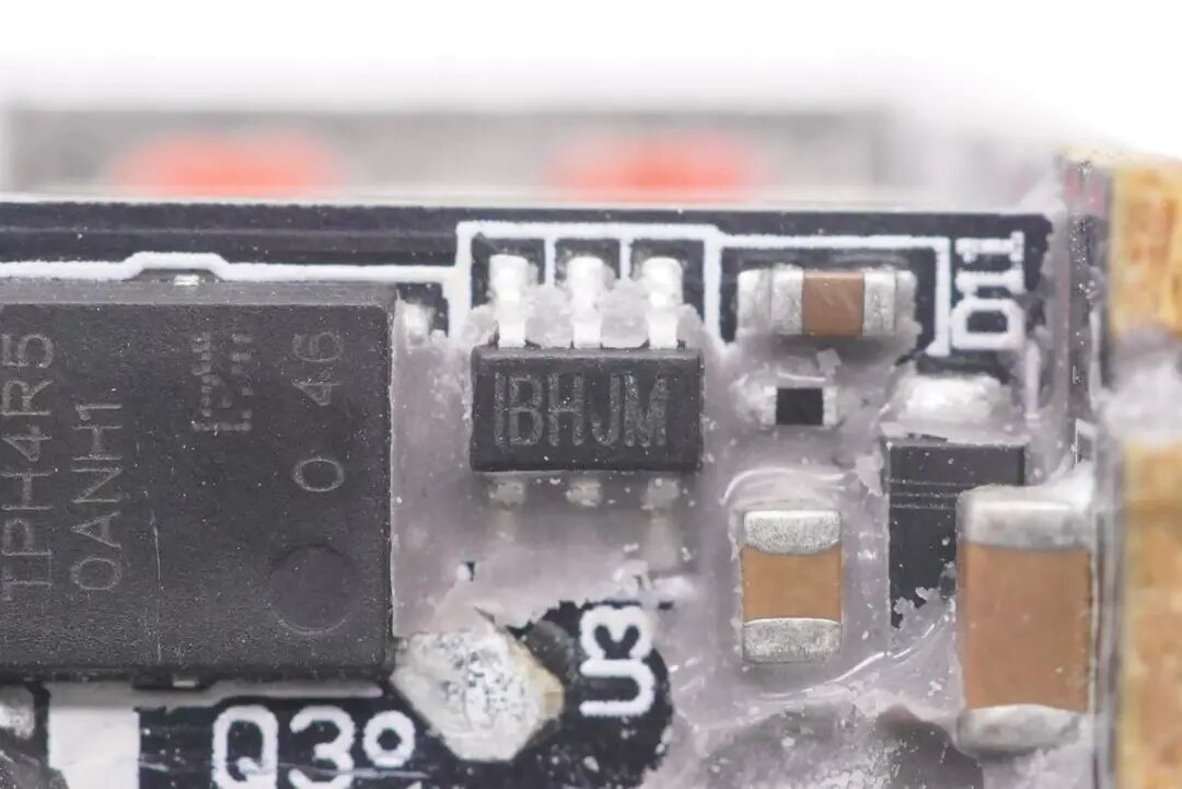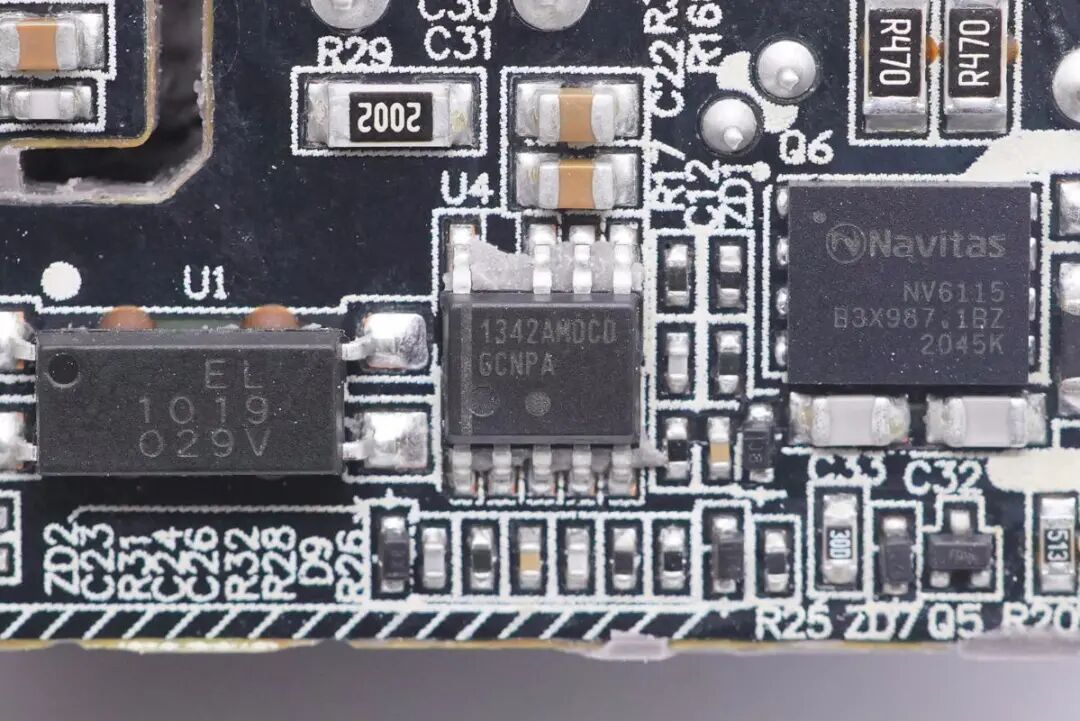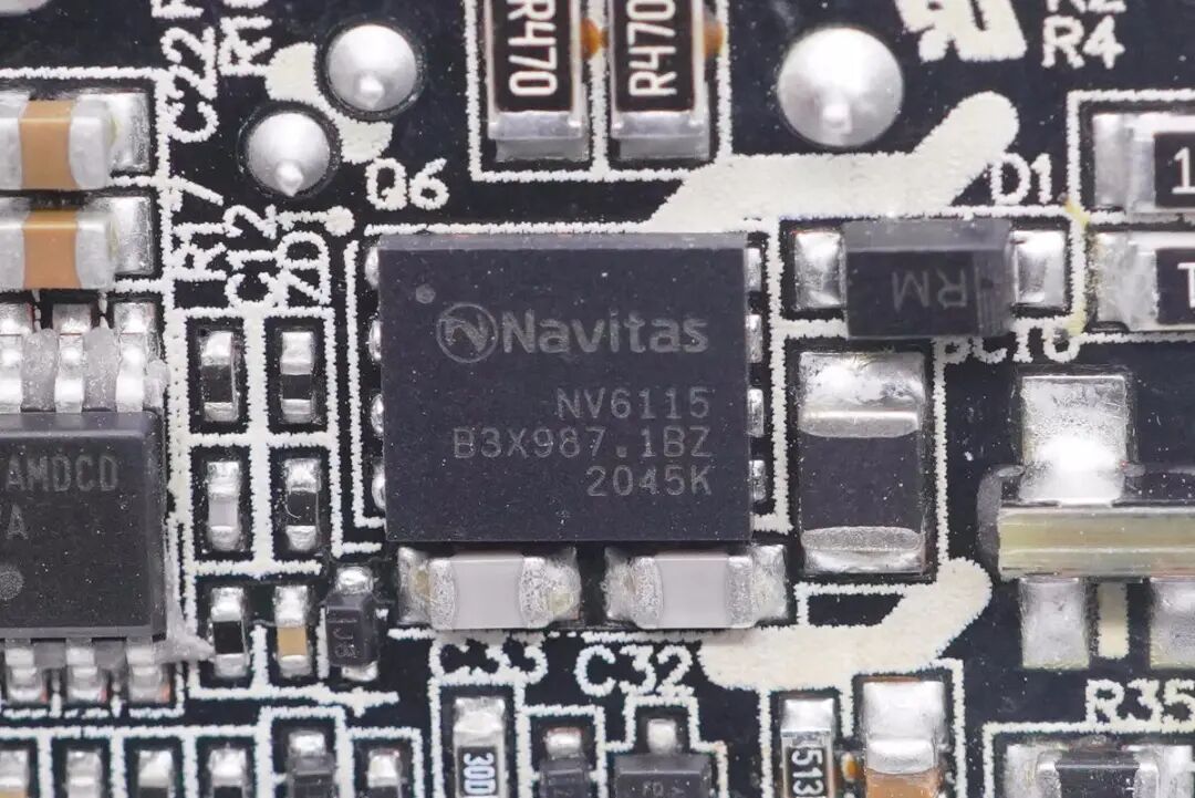 小米55W氮化镓充电器采用纳微NV6115 GaN功率器件,内置驱动器以及复杂的逻辑控制电路,170mΩ导阻,耐压650V,支持2MHz开关频率,采用5*6mm QFN封装,节省面积,得益于NV6115内置驱动器,无需外置驱动器,更加节省PCB空间。