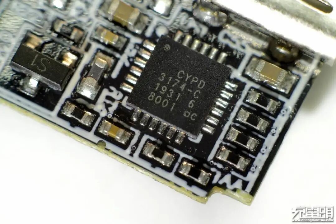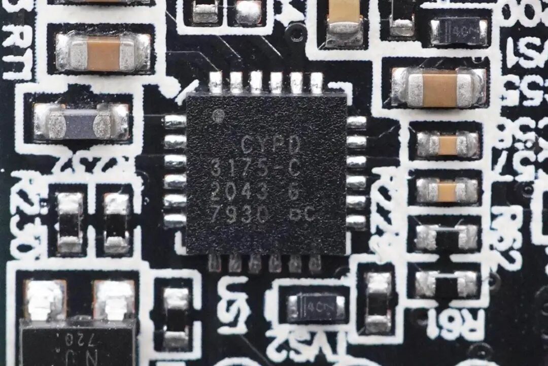 小米33W氮化镓充电器协议芯片采用赛普拉斯CYPD3175。这款芯片支持1A1C接口,支持QC4.0和其他快充协议,集成次级反馈和输出电流检测放大器,内置多重完善的系统级保护,内置32位MCU,内置时钟,支持3-24.5V宽泛的工作电压范围。