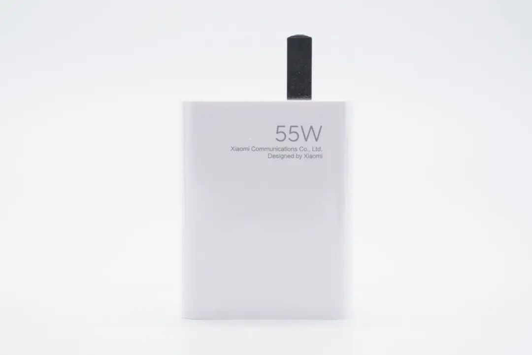 小米55W氮化镓充电器采用长方体造型,整机尺寸为52.44mm*42.19mm*28.54mm,腰身亮面,固定式国标插脚,且靠侧边设计。